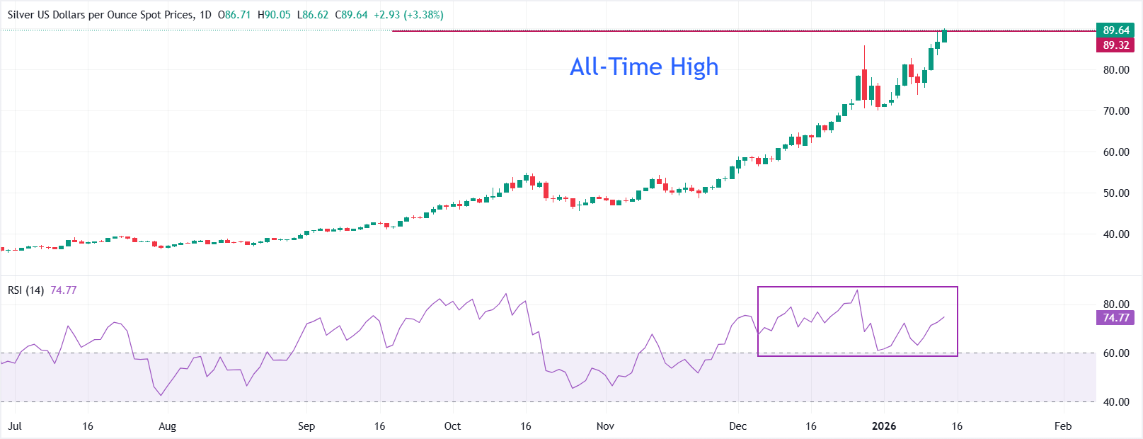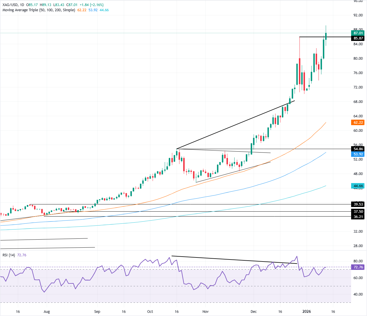 Silver Price Forecast: XAG/USD jumps to record high past $89.00 as bullish momentum fades